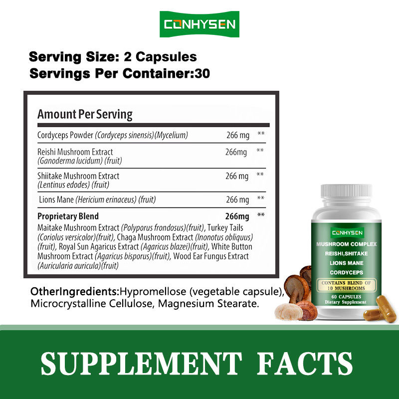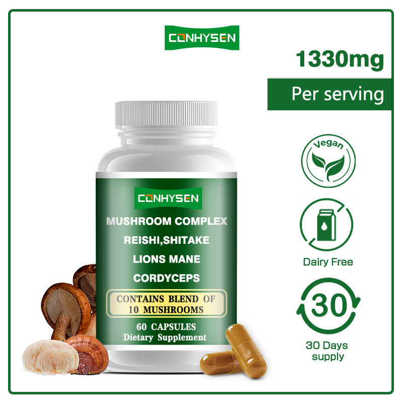 كبسولات مجمع الفطر هي مكمل غذائي تم تركيبه علميًا وتنقيته من فطور وظيفية مختلفة مثل فطر ريشي وشيتاكي وفطر لينغزي ومشروم تريميلا. يشتمل على المكونات النشطة الثمينة مثل السكريات المتعددة، التربينويدات، الإرغوثيونين، والمعادن من هذه الفطريات، ويعمل كمستودع صحي طبيعي يوفر حماية صحية متعددة الأبعاد لجسم الإنسان.