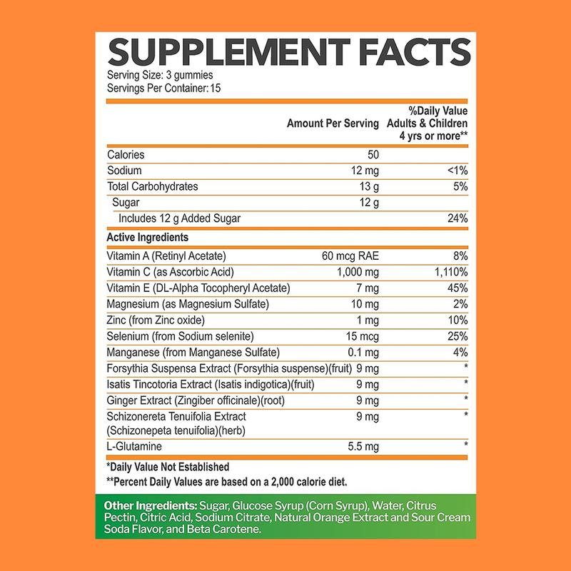 فيتامين (ج) ، فيتامين (أ) ، فيتامين (إ) ، الزنك، المغنيسيوم، السيلينيوم، المنغنيز، مستخلص الزنجبيل، مستخلص فورسيثيا سوسبانسا، مستخلص إيساتيس تينكوتوريا، مستخلص شيزونريتا تينوفوليا، L- غلوتامين