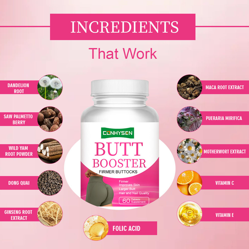 منتج Butt Booster Tablets منشركة قوانغدونغ كانغشينغ للتكنولوجيا الصيدلانية المحدودةيحتوي على كمية كبيرة من الإستروجينات النباتية ومكونات الكولاجين. يمكن أن تحفز نمو وتوزيع الخلايا الدهنية في الأرداف،يساعد على زيادة حجم الأرداف بشكل طبيعي وآمنإذا استمريت في تناولها، ستصبح مؤخرتك أكثر سمكاً وتقليلاً، مع منحنيات أكثر جاذبية.
