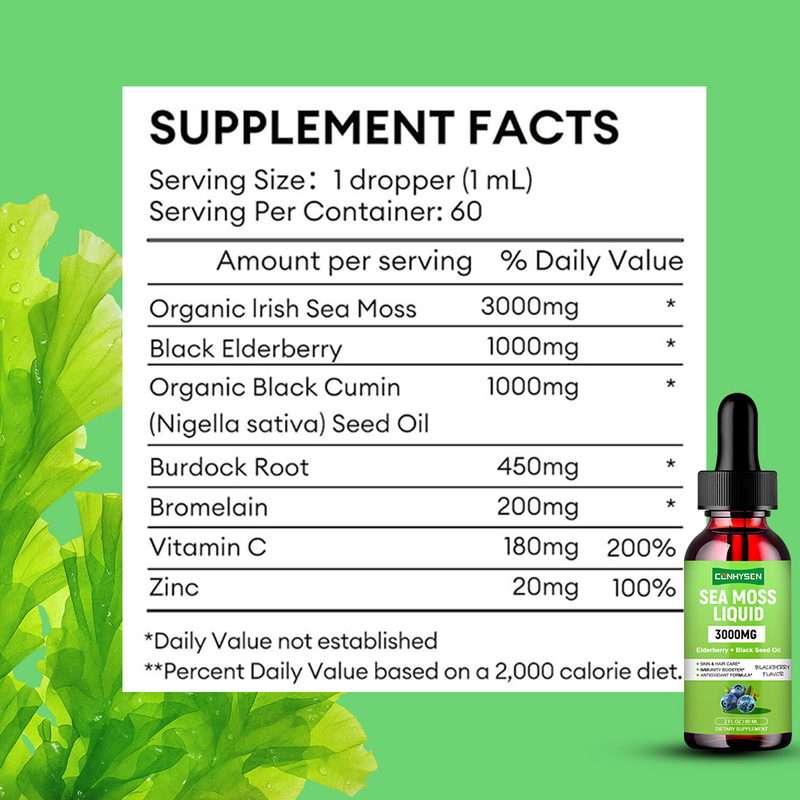طحالب البحر الأيرلندية العضوية، فيتامين سي، البلسان الأسود، جذر الأرقطيون، الكمون الأسود العضوي، البروميلين، الزنك