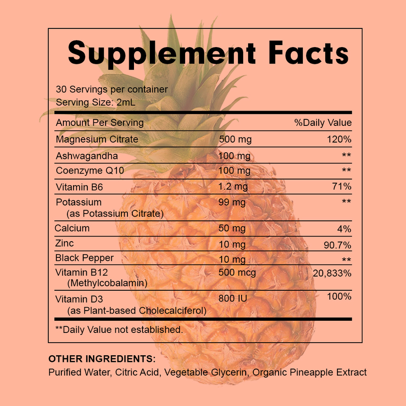 سيتريت المغنيسيوم، أشواغانثا، الكوينزيم Q10، فيتامين B6، البوتاسيوم، الكالسيوم، الزنك، الفلفل الأسود، فيتامين B12، فيتامين D3