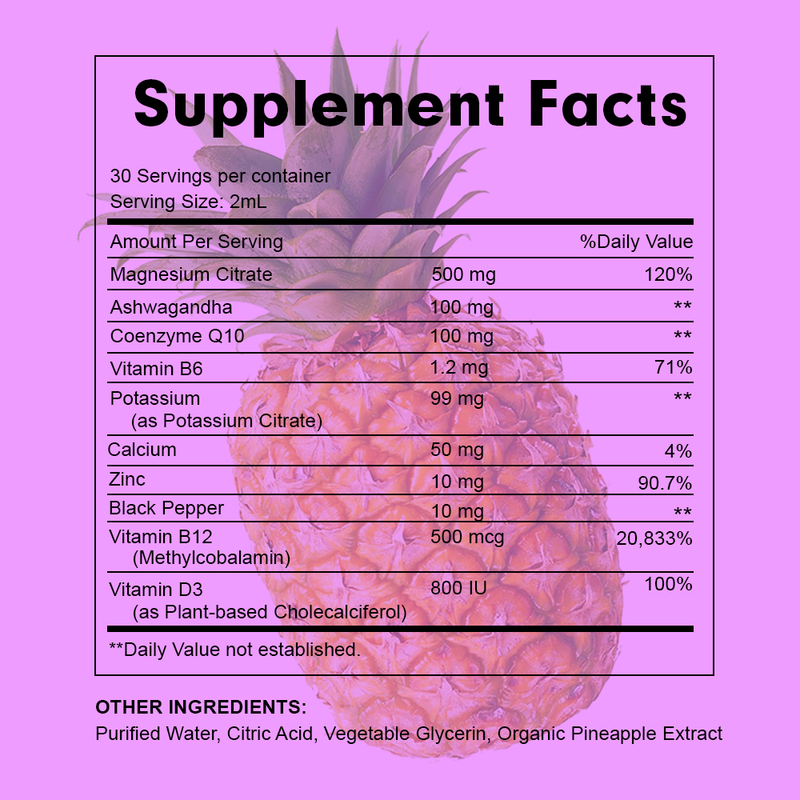 سيترات المغنيسيوم، أشواغاندا، إنزيم Q10، فيتامين B6، بوتاسيوم، كالسيوم، زنك، فلفل أسود، فيتامين B12، فيتامين D3